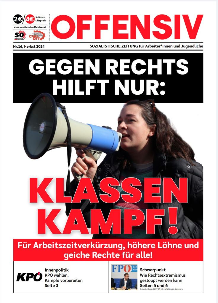 Pünktlich zum Volksstimmefest am 31.8./1.9.2024 haben wir unsere Zeitung neu gelauncht – sie heißt jetzt „Offensiv“ und erscheint zwölfseitig. Ihr könnt das PDF hier gegen eine kleine freiwillige Spende herunterladen – bitte überweisen an: IBAN: AT53 2011 1850 2391 0700 – Verein Sozialistische Offensive