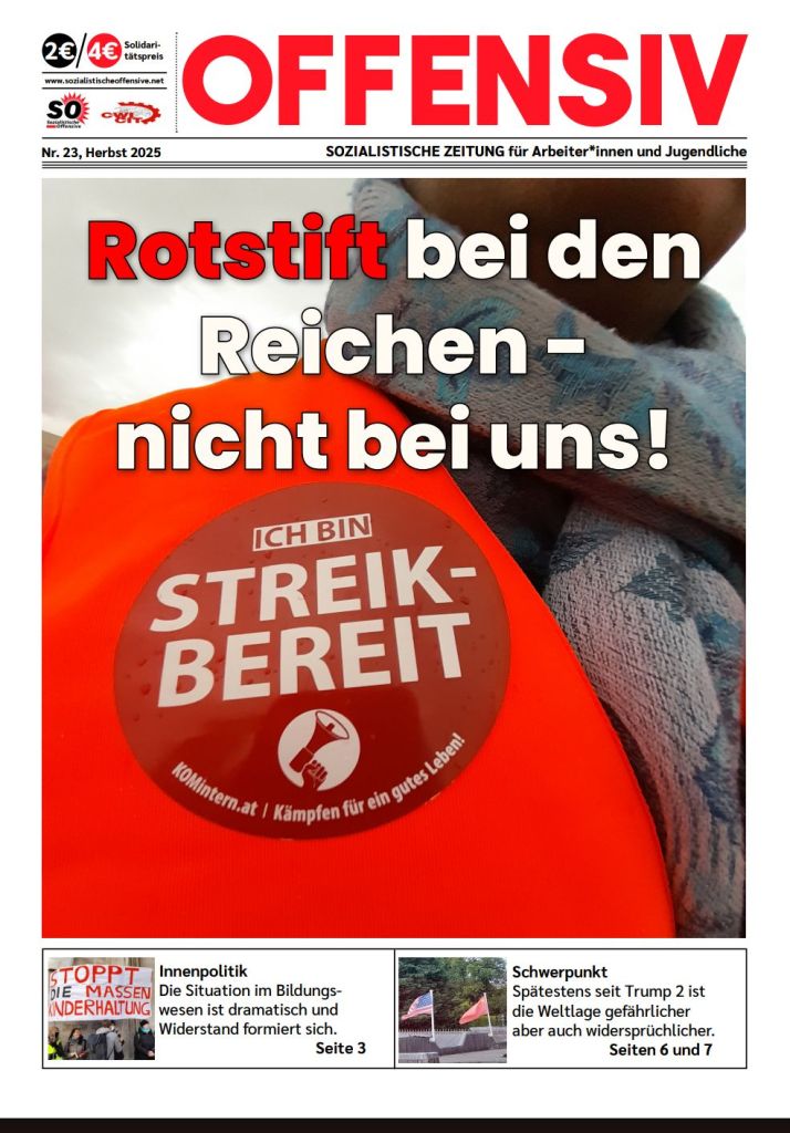 Die neue Ausgabe von Offensiv ist da – Nr 23. Ihr könnt die Printversion gemeinsam mit zwei Neuerscheinungen im Manifest-Verlag mit Österreich-Bezug und unseren Trotzki Broschüren bei unserem Stand am Volksstimmefest (30. und 31.8.) erstehen – ihr findet uns auf Stand 168. Werdet aktiv mit uns für eine sozialistische Welt!