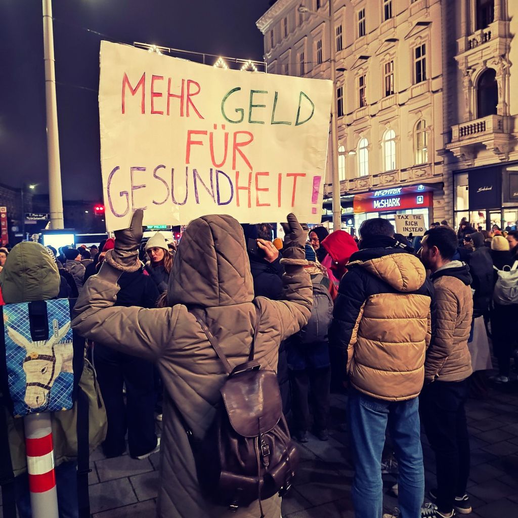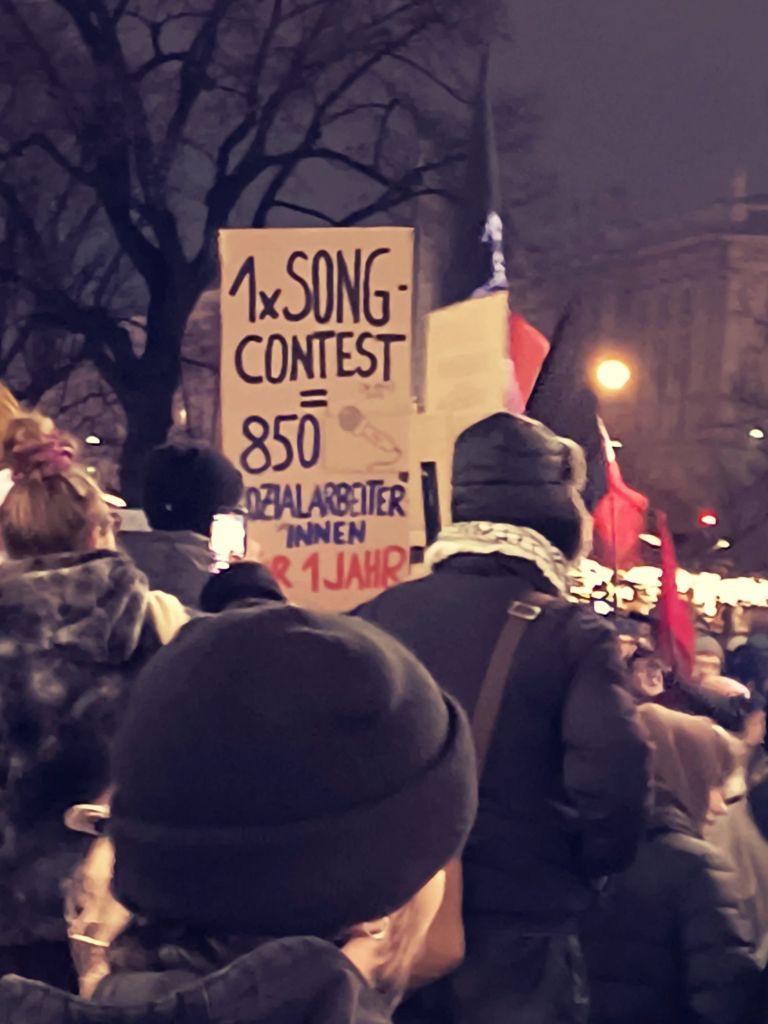 Gleichzeitig hält die Stadtregierung an teuren Prestige-Projekten wie dem Umbau von St. Marx zur Eventhalle fest. So liegt es nahe, dass der Demozug vom Platz der Menschenrechte ausgehend beim Rathaus endete und dieses “belagerte”. Erneut wurden Slogans wie “Wir zahlen nicht für eure Krise”, “Wir sind streikbereit”, oder “Nieder mit dem Sozialabbau” gerufen. Auf den Kundgebungen wurde die Rolle der Beschäftigten und ihre Einheit betont – trotz des Versuchs der Stadt mit gruppenspezifischen Zugeständnissen die einzelnen Betriebe zu spalten. Dass dies nicht nur leere Worte sind, zeigt die ungewöhnlich hohe Zahl an Streiks und Protesten im Dezember, wie auch die stetig wachsende Teilnehmer*innenzahl. Von vielen betroffenen Stellen haben zahlreiche Beschäftigte mit eigenen Blöcken, Transparenten, Warnwesten und selbst gemalten Taferln an der Demonstration teilgenommen und sie mitgetragen. Bemerkenswert war wieder das große Verständnis und die enorme Unterstützung von Passant*innen und Außenstehenden. Auch zahlreiche Menschen aus dem Ausland, wie zum Beispiel Griechenland, Frankreich, Luxemburg und Litauen haben sich solidarisch an dem Protest beteiligt, da es in ihren Heimatländern ähnliche Drohungen und Proteste gibt. Dies zeigt, dass Wien und Österreich weder in der kapitalistischen Krise, noch im Protest und Streik dagegen isoliert stehen. Vielmehr reihen sie sich in das die Welt umspannende Gefühl ein, dass das jetzige System keine vernünftigen Lösungen parat hat.